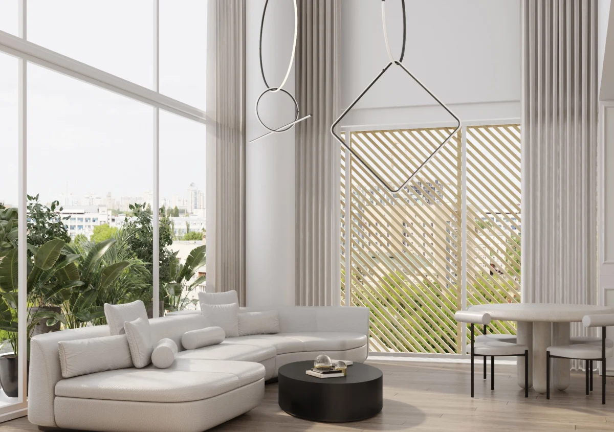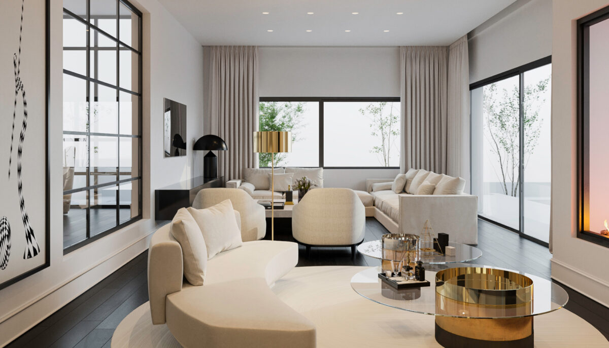 Throughout all the rooms the deceptively simple yet sophisticated colour scheme is accented by wood, dark leather, bronze and gold fixtures, and stone in shades of buff and grey. The individual fixtures and furnishing elements are few and minimalist, adapted to the architectural aesthetic, and exquisitely designed. Generously proportioned sofas in the living room, upholstered in white, were created by Meridiani.