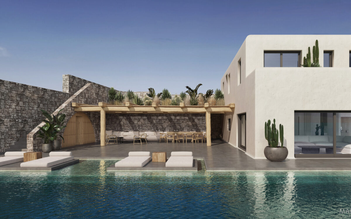 An existing house has been transformed by Maria Kardami Design Studio into an elegant and luxurious holiday villa with guest quarters and a separate spa, set into a series of stone-walled terraces on the shore of Ornos Bay, Mykonos.